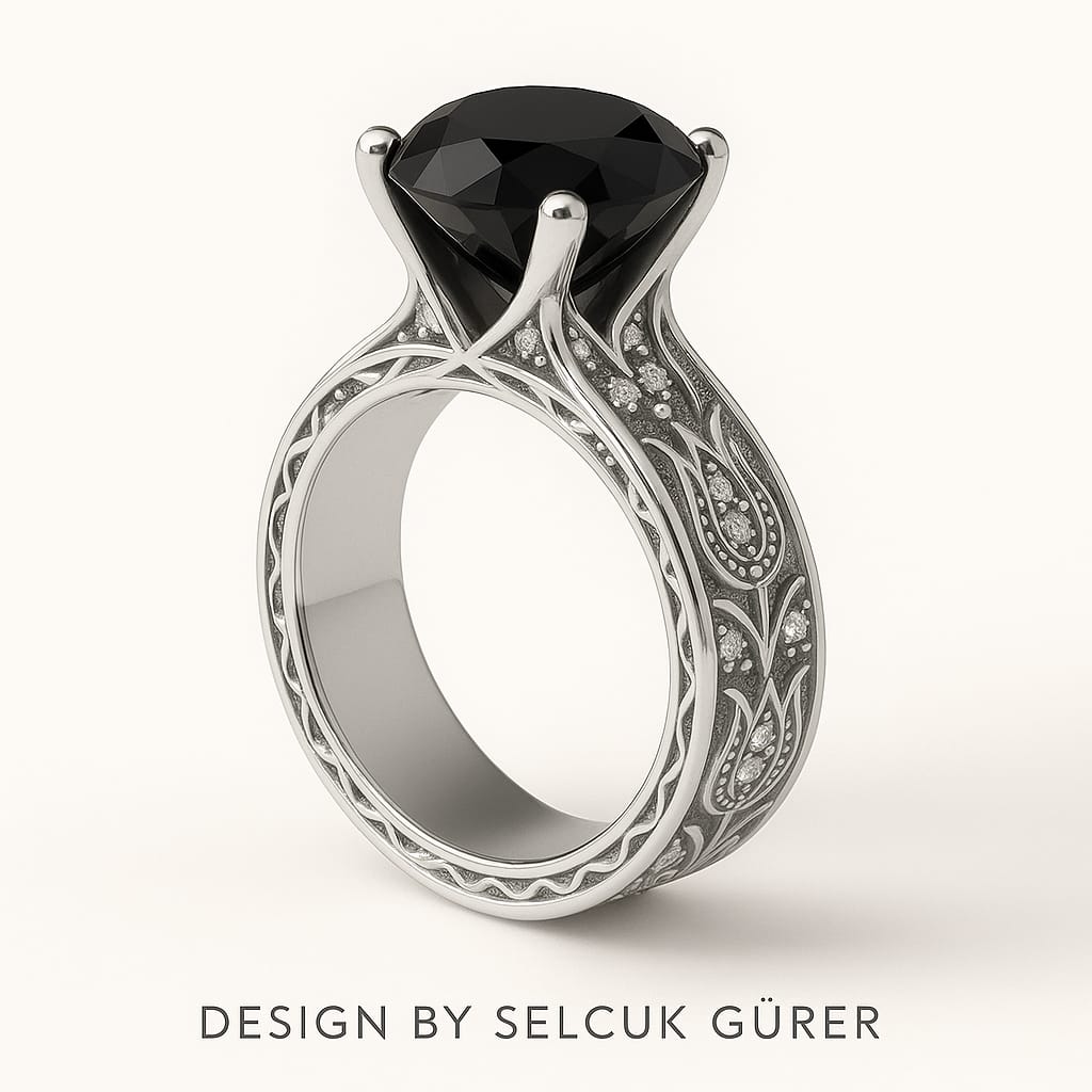 18 Ayar Sarı/Beyaz Altın yanları lale oyma sanatı ile işlenmiş yanlarında 0,30/1ct arasında beyaz F kalite uluslararası certificalı pırlanta ile modellenmiş üstünde ortasında 13 ct doğal siyah pirlanta ile modellenmiş Eternal Serisi Dünya'da 33 adet üretilecektir. Parakende satış fiyatı 9.750.000 euro