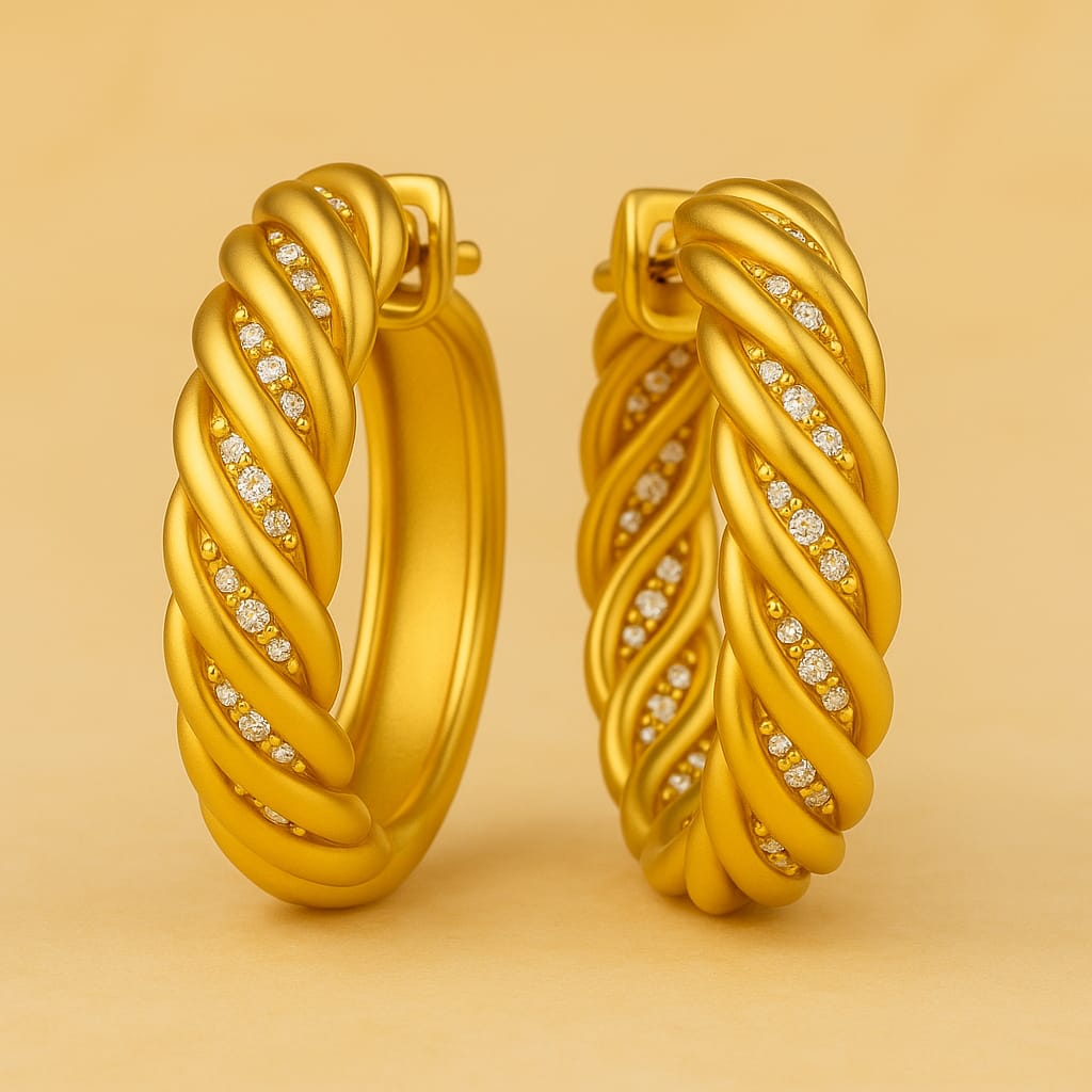 18 ayar Sarı / beyaz altın burma kıvrımlarına küçük beyaz pırlantalar konumlanmış 0,20/1ct aralıgında F kalite uluslararası certificalı pırlanta ile modellenmiş Güzelliği Sarmalı serisi küpe modeli Dünya'da sadece 500 adet üretilecektir. Parakende satış fiyatı 8340 euro'dur.