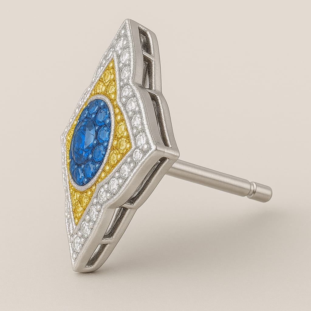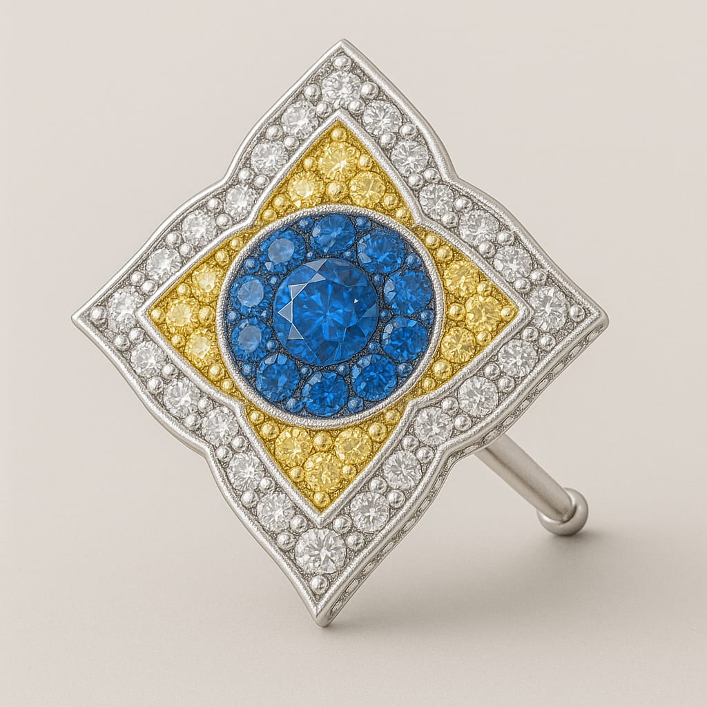 Ekınox çiçeği modelinde 18 ayar Sarı/ beyaz altın üzerine işlenmiş yanlarda beyaz pırlanta F kalite bir iç kısımda Sarı pırlanta orta kısmında yuvarlak fasetli kesim mavi pırlanta ile komumlanmış özel tasarım Ruhun Doğaya Seslinişi serisi Dünya'da sadece 120 adet üretilecektir satış fiyatı 65.000 euro