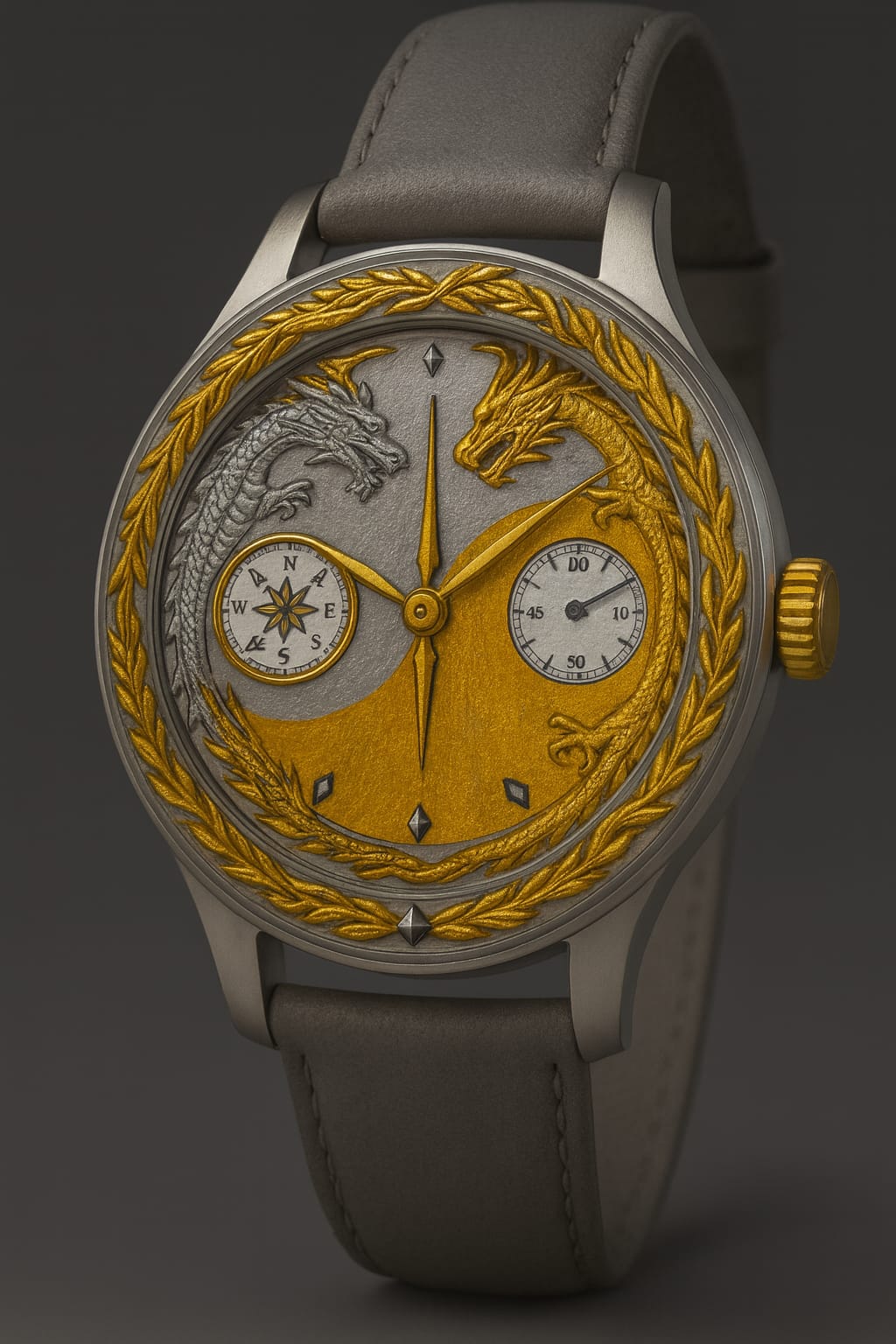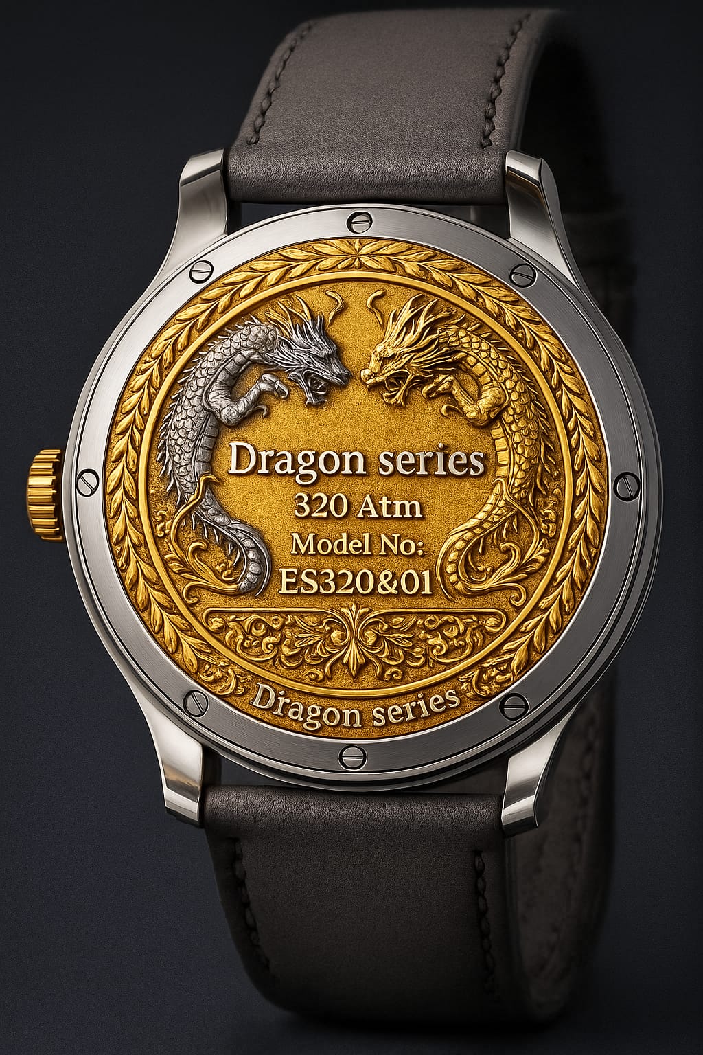 18 ayar Sarı /Beyaz Altın Dragon serisi kadran Dragon oyma sanatı ile işlenmiş Otomatik Mekanizma pusula kronometre özellikleri ile çok özel bir seridir. 320 Atm metre su geçirmiyor safir kırılmaz cam ile Dünya da sadece 32 adet üretilecektir. Parakende satış fiyatı 3.200.000 euro'dur